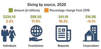 Despite the pandemic and economic downturn, 2020 was the highest year for charitable giving on record, reaching $471.44 billion. Giving to public-society benefit organizations, environmental and animal organizations, and human services organizations grew the most while giving to arts, culture, and humanities and health organizations declined.