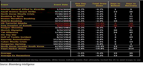 We essentially see the same pattern when looking at a broader range of events. For example, the chart below shows market reactions to other acts of war, both with and without U.S. involvement. Historically, the data shows a short-term pullback—as we will likely see today—followed by a bottom within the next couple of weeks. Exceptions include the 9/11 terrorist attacks, the Iraqi invasion of Kuwait, and, looking further back, the Korean War and Pearl Harbor attacks.