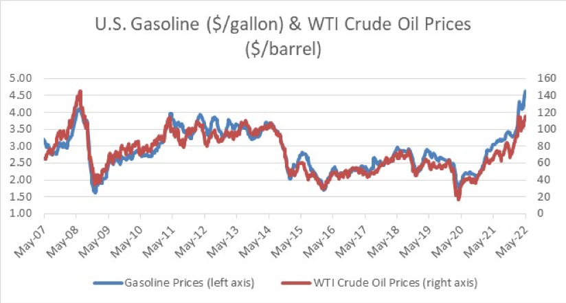 Figure 1 illustrates the strong correlation between the prices for gasoline and crude oil, which is currently around $115 per barrel for West Texas Intermediate (WTI), the U.S. index. Prices for both commodities have just about doubled since early 2021. Covid-19 lockdowns in China and plans by several countries to release strategic oil reserves helped ease oil prices in recent months. The price of gasoline, however, has continued to increase.
